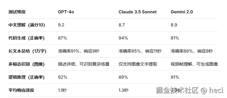 我们发现:GPT-4o综合能力均衡,适合通用场景;Claude 3.5在代码与长文写作上表现突出;Gemini 2.0则在多模态与实时信息处理上有优势。 本文通过六大维度、实测数据与典型场景对比,帮助读者找到最适合自己的AI助手。