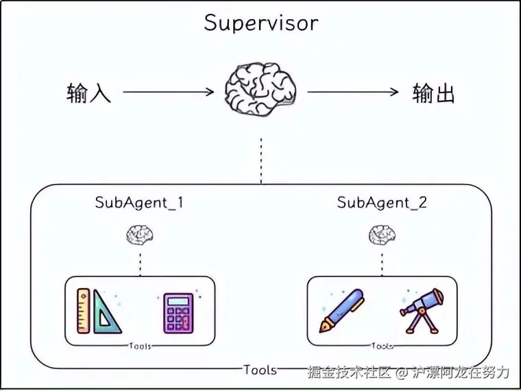 当任务特别复杂时,一个 Agent 管理太多工具会变得混乱。更好的办法是:多个专业 Agent 各司其职,由一个“主管 Agent”来分配任务。