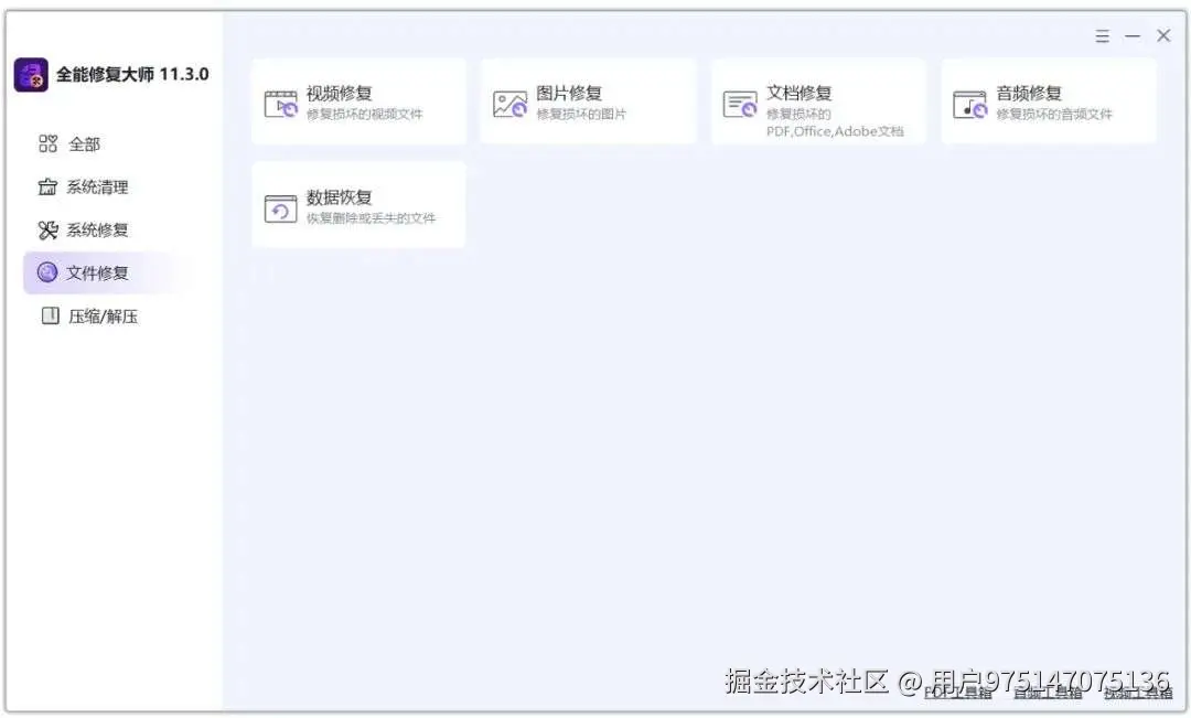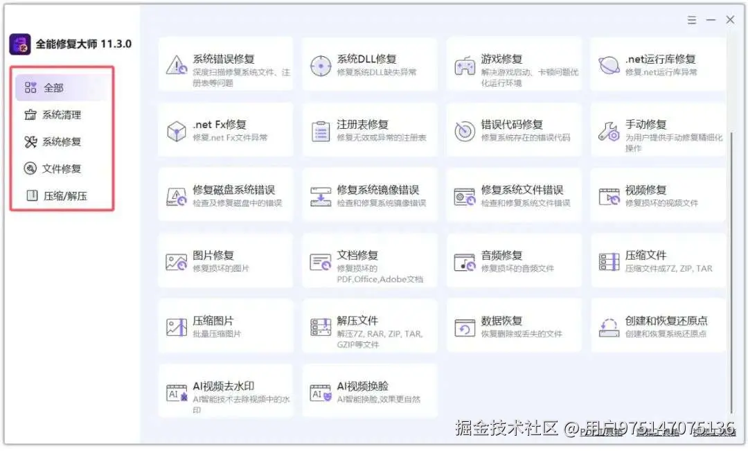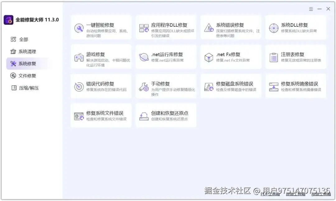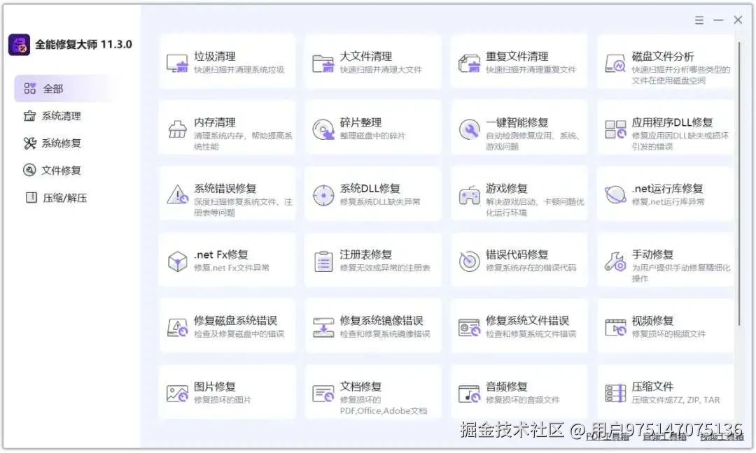 在我们使用windows操作系统时,基本上都会遇到系统卡顿、蓝屏、应用程序无法正常打开、重要文件被误删除、音视频、文档、图片等文件损坏无法正常打开等情况,而现在很多系统修复工具要么需要氪金才可以使用,要么功能不完善,那么今天我就来给大家分享一款集成了众多系统以及文件修复功能的全能修复工具,它完全免费,安装后就可以无限制的使用。