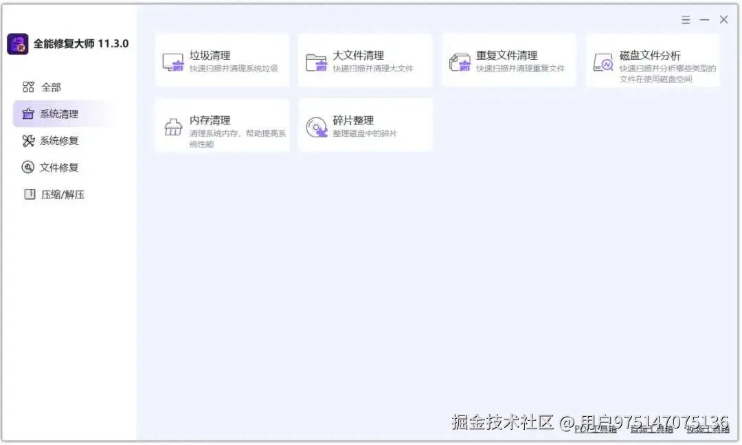 在软件的界面可以看到,它分为系统清理、系统修复、文件修复和压缩解压四大类别。