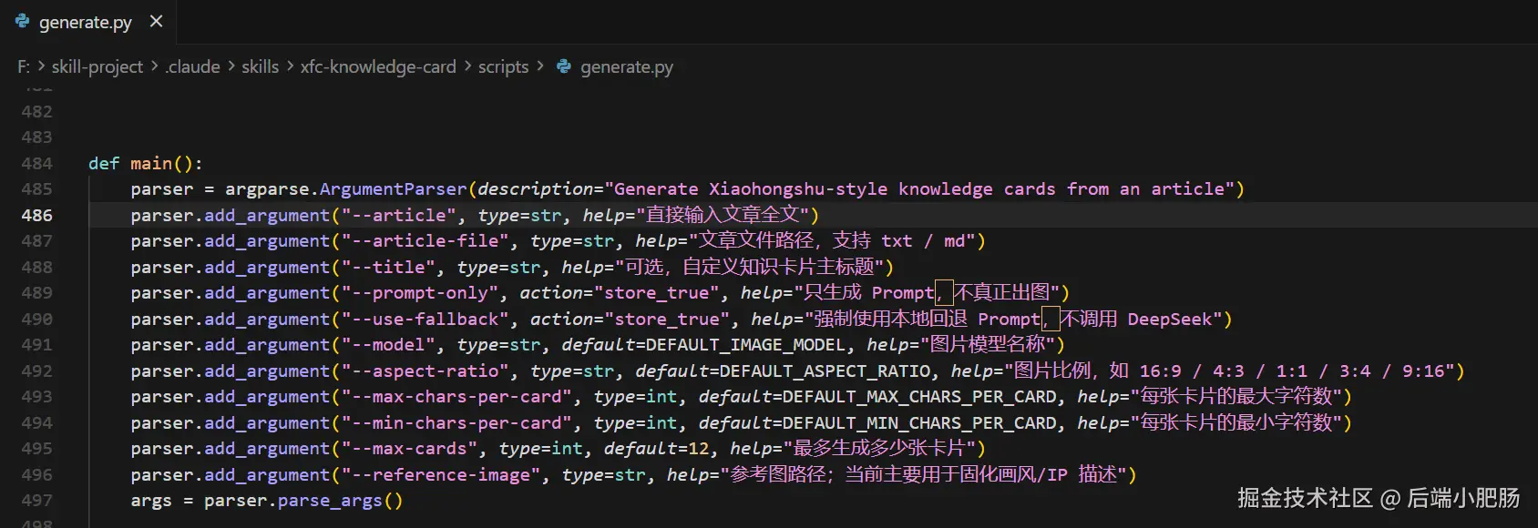 SKILL.md 的设计思路很简单:定义好输入协议(支持直接传文章文本或文件路径)、执行步骤(拆卡→生成Prompt→出图→归档)、以及输出格式。OpenClaw 读到这份说明书,就知道该怎么调用这个 skill 了。