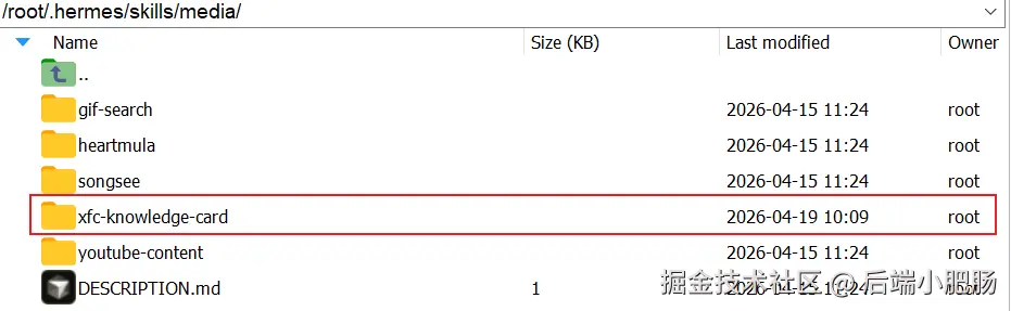 Hermes的安装请查看Hermes Agent喂饭级教程:安装、迁移 OpenClaw、接入飞书全流程,依然是利用FTP工具将skill文件上传至Hermes所在服务器的/root/.hermes/skills/media/目录下: