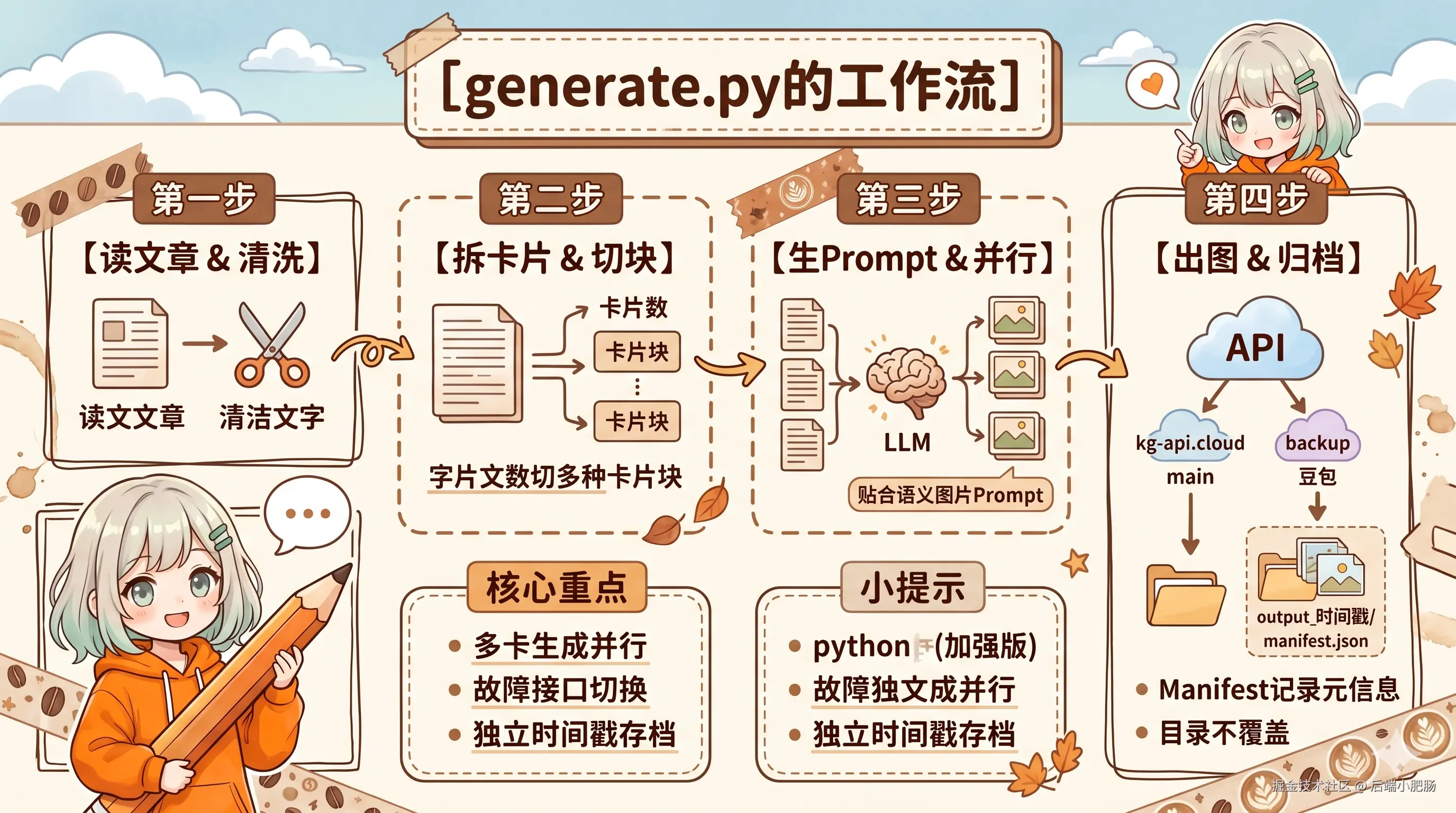 generate.py 的整体思路分四段:读文章、拆卡、生成 Prompt、出图归档。读进来的文章先做清洗,再按字数切成若干卡片块;每块调用大模型生成贴合语义的图片 Prompt,最后批量出图、按时间戳归档到独立目录,不会互相覆盖。