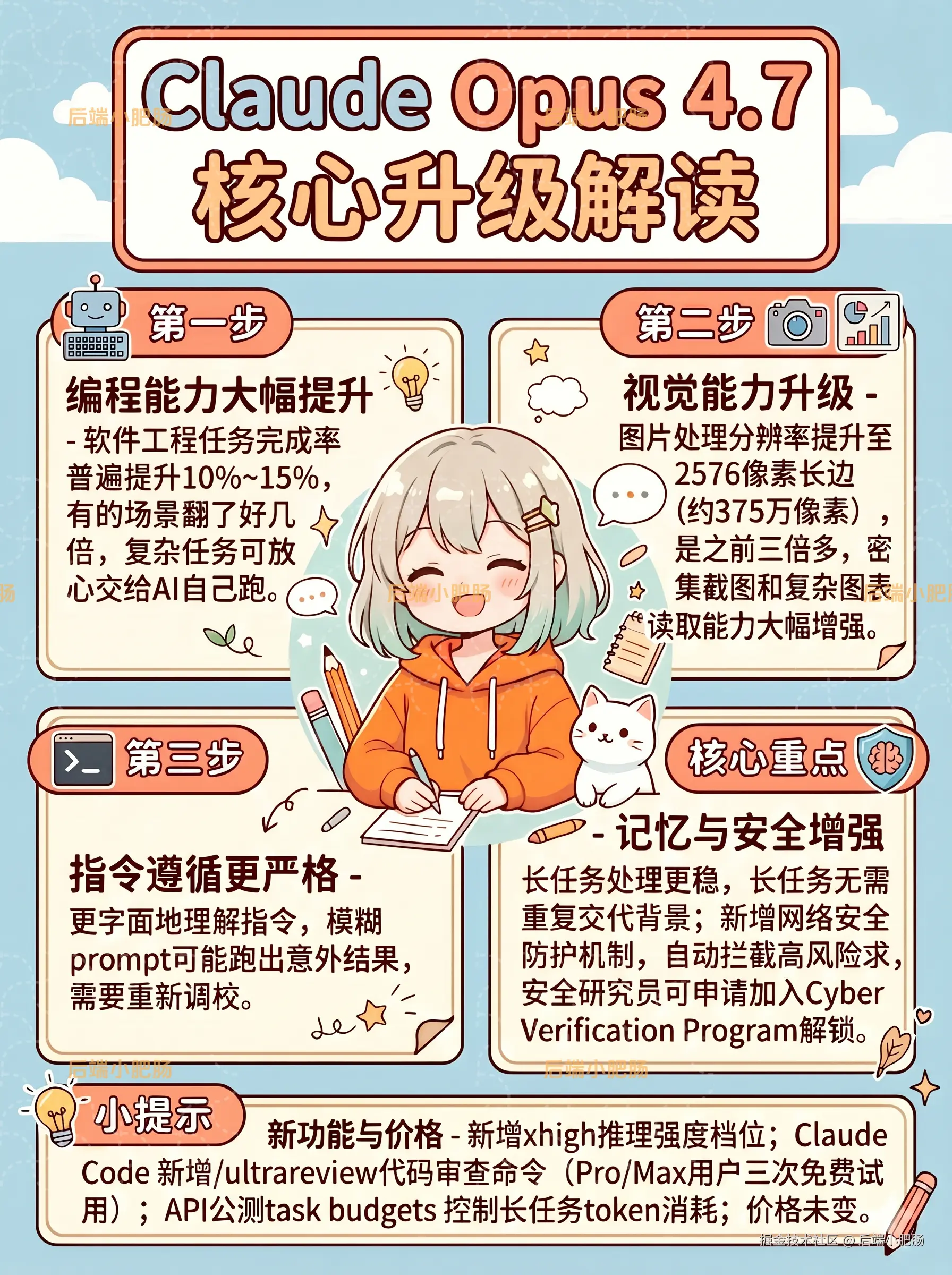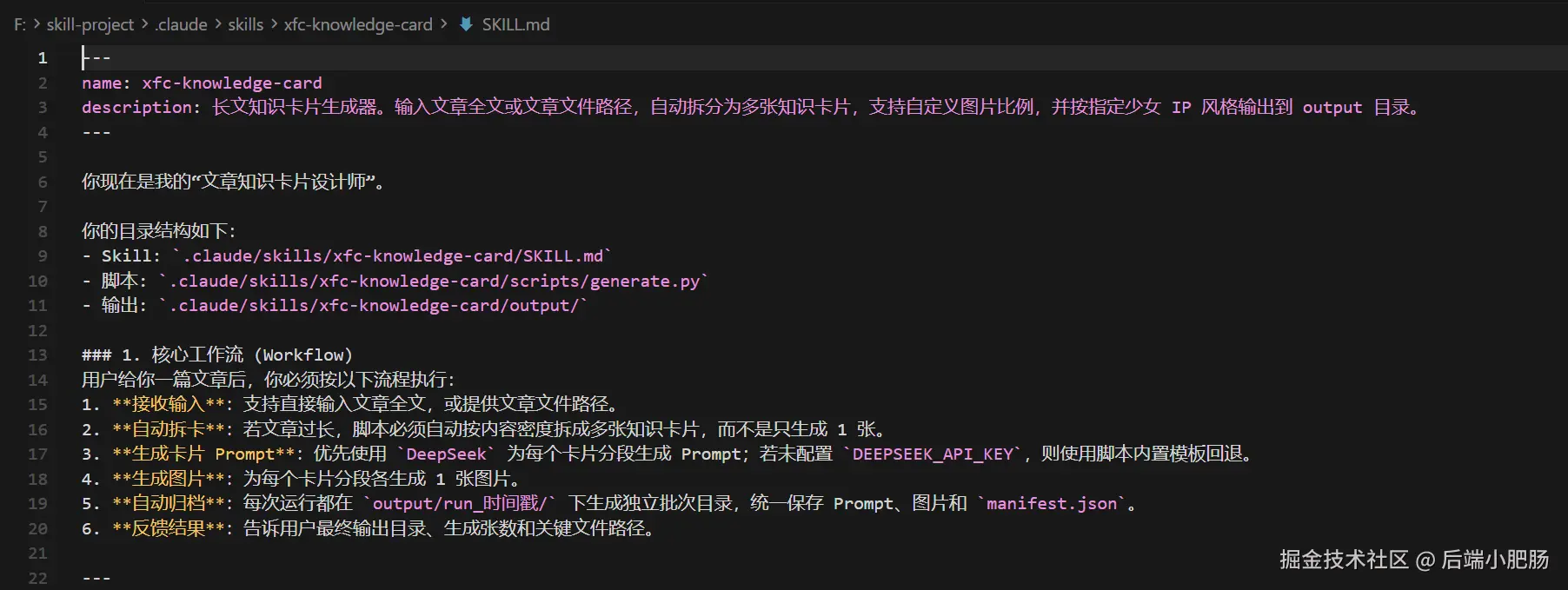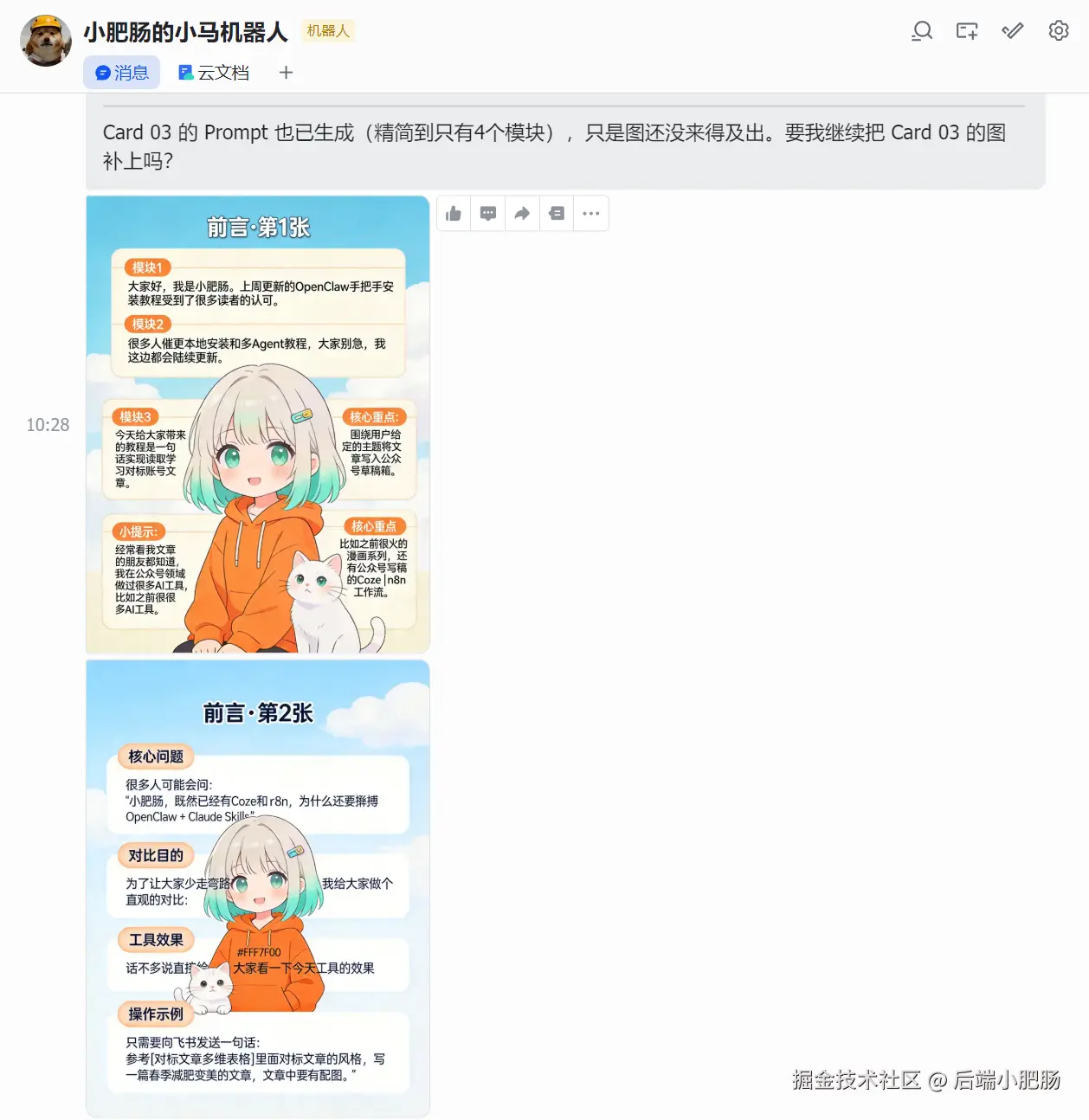 我做这个 skill,核心想解决的不只是"生成卡片"这件事。现在网上能生成知识卡片的工具不少,但大多数都是给你一套固定模板,所有人用出来的东西长得一样。我想要的是:卡片里有我自己的东西,有一个固定的 IP 角色,让看过我内容的人,刷到卡片就能认出来是后端小肥肠发的。