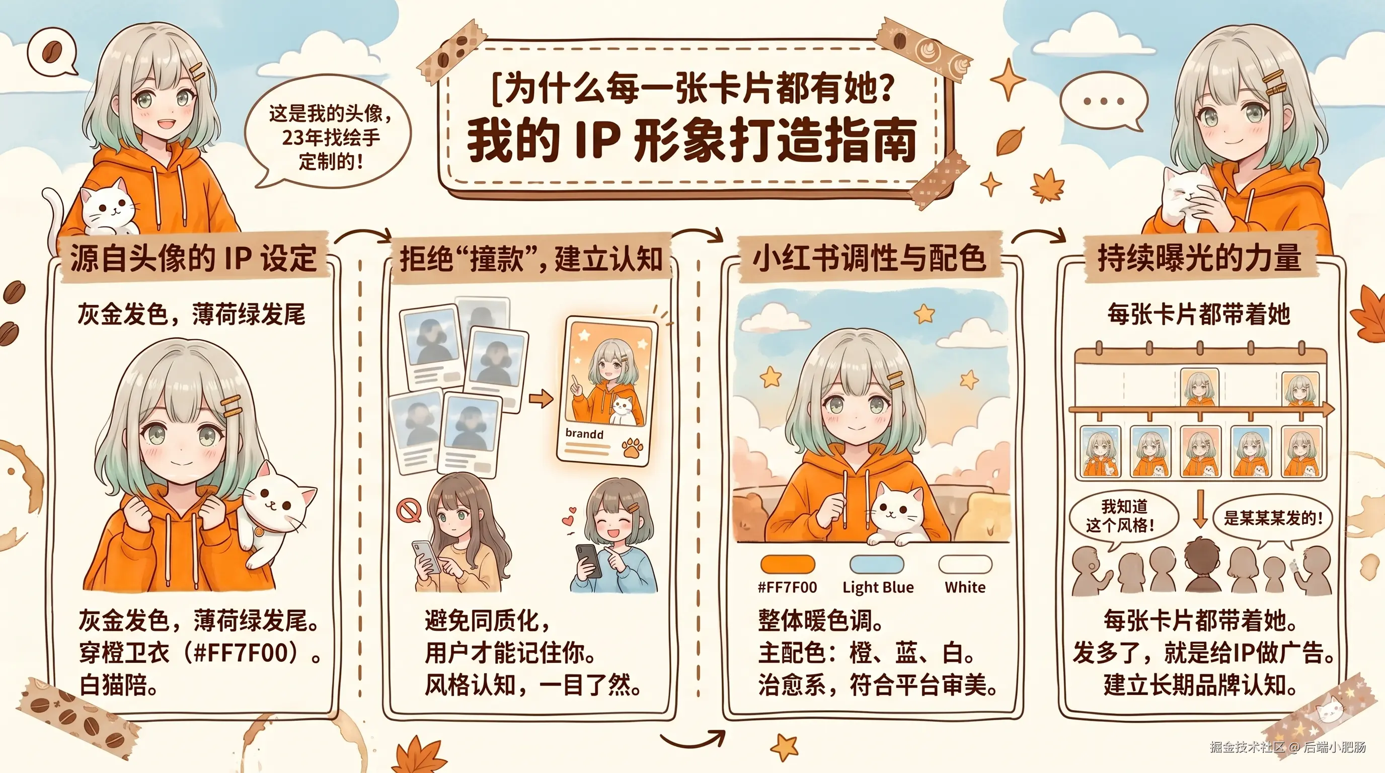 配色以浅蓝、橙色、白色为主,整体偏暖,适合小红书的调性。每次生成的卡片都会带着这个角色,发多了就是在给自己的 IP 做曝光。