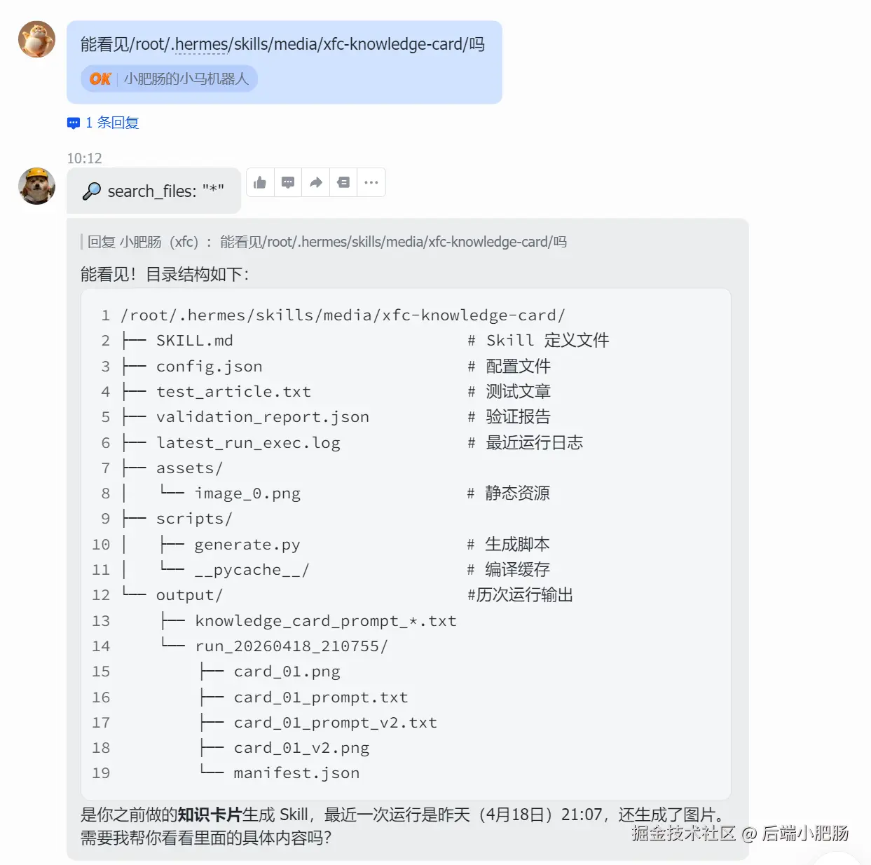 skill编写完就可以集成使用了,常看我文章的读者都知道Hermes和Openclaw两个工具我都有在用,skill可以集成至openclaw多Agent中,也可以集成到Hermes里,下面将依次演示。