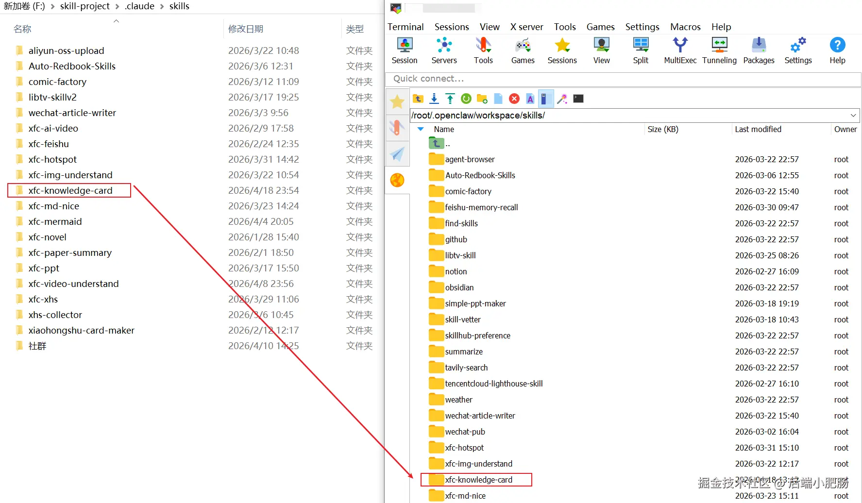 将编写完成的xfc-knowledge-card利用FTP工具上传至Openclaw所在服务器的/root/.openclaw/workspace/skills/目录。