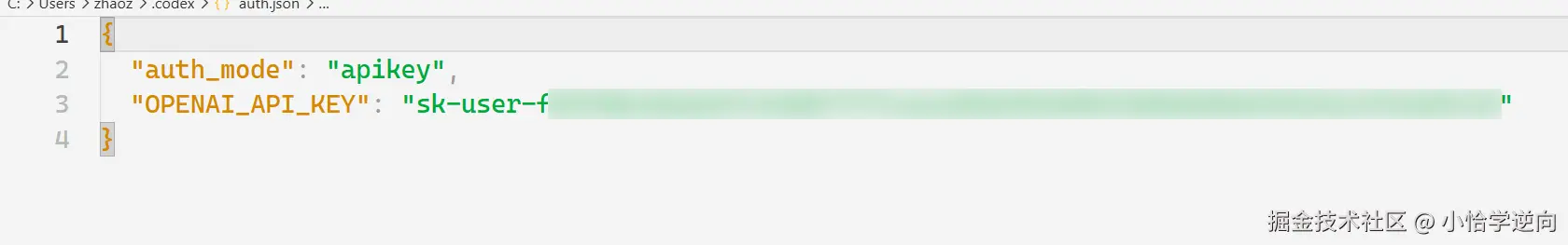 然后找到 auth.json 文件,这个文件就是用来配置 API-KEY 的,当然第一次使用时你按照我前面说的已经填入了相关中转站或官方提供的 API-KEY ,如果后续需要更改,可以在这个文件中修改。