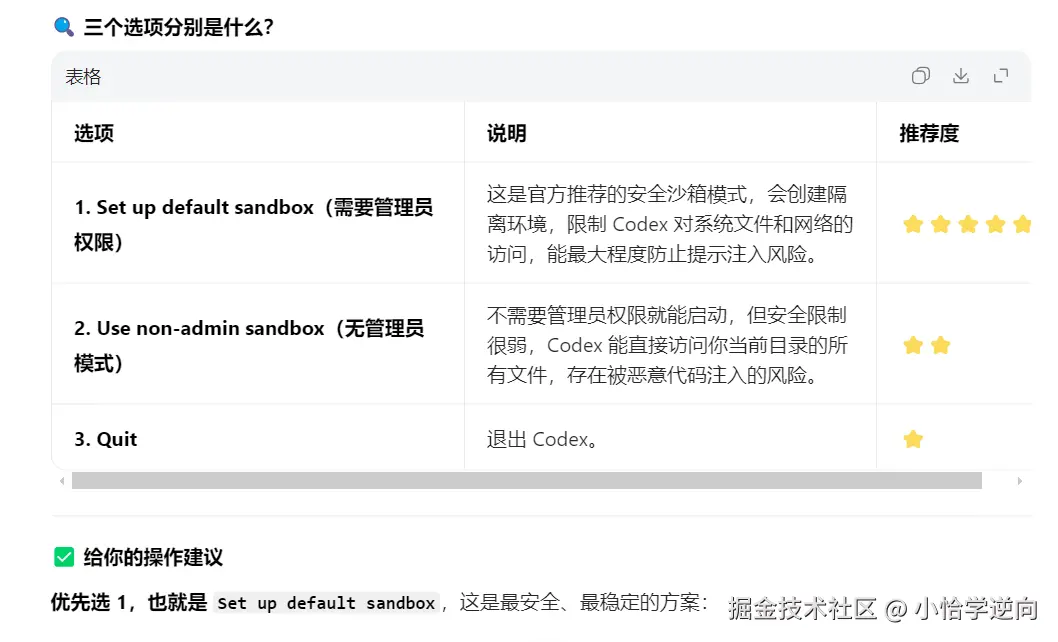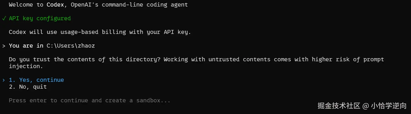 出现这个页面,就说明 codex 这个命令行调用工具已经成功安装,出现的三个选项分别为: