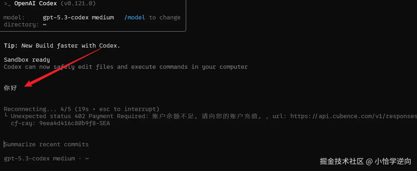 因为我还没有购买服务,所以它会提示 账户余额不足 ,但这无关紧要,只要确保 codex 能正常调用模型即可。