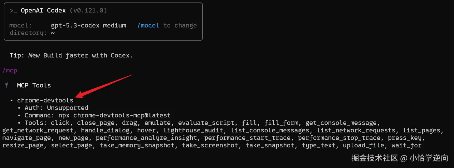 打开 codex ,输入 /mcp 可检查是否下载成功: