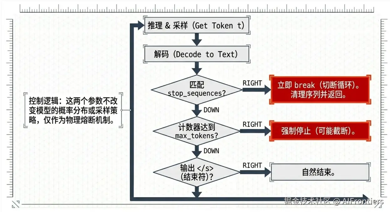 - 截断停止后,把命中的 stop sequence 从输出中删掉(可选) 返回干净文本。