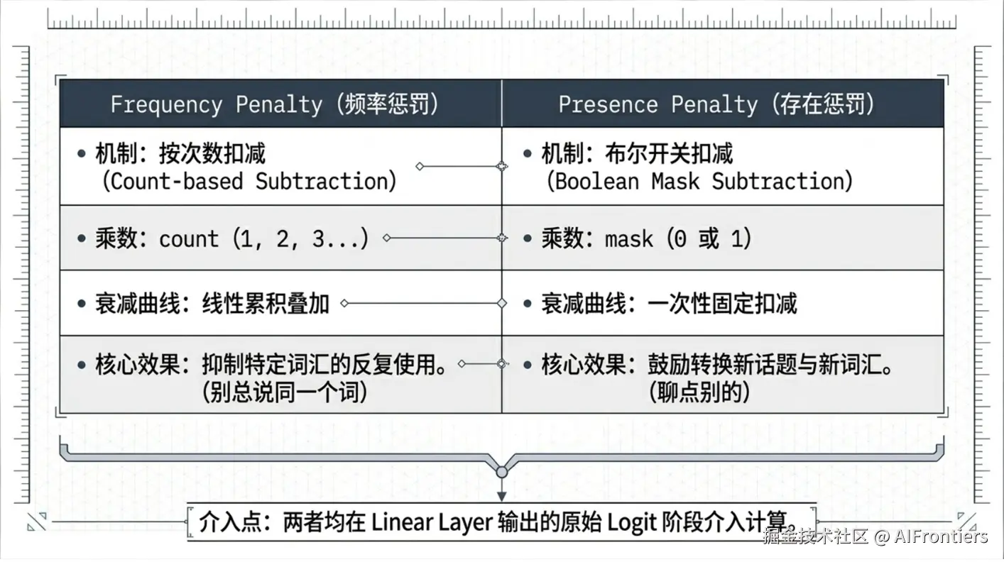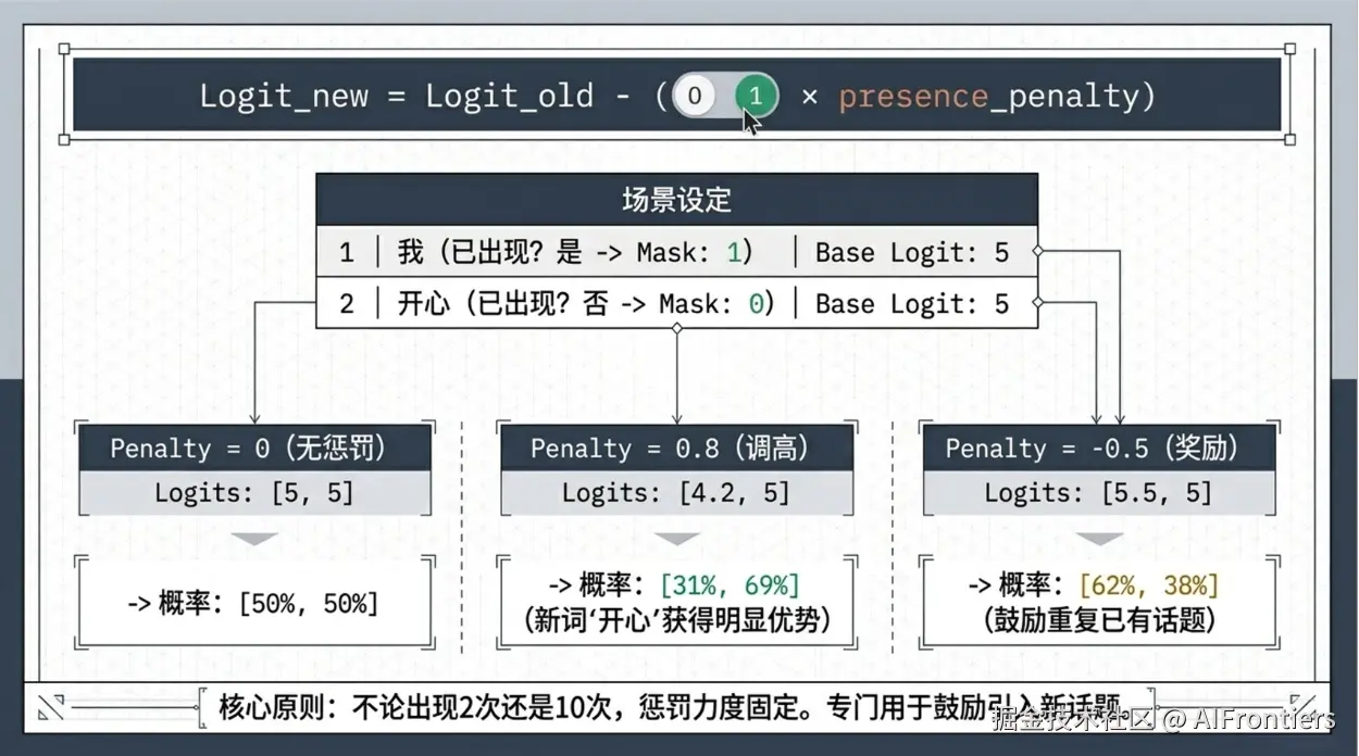 与 frequency_penalty 类似,也是在原始 Logit 值上减去一个偏移量