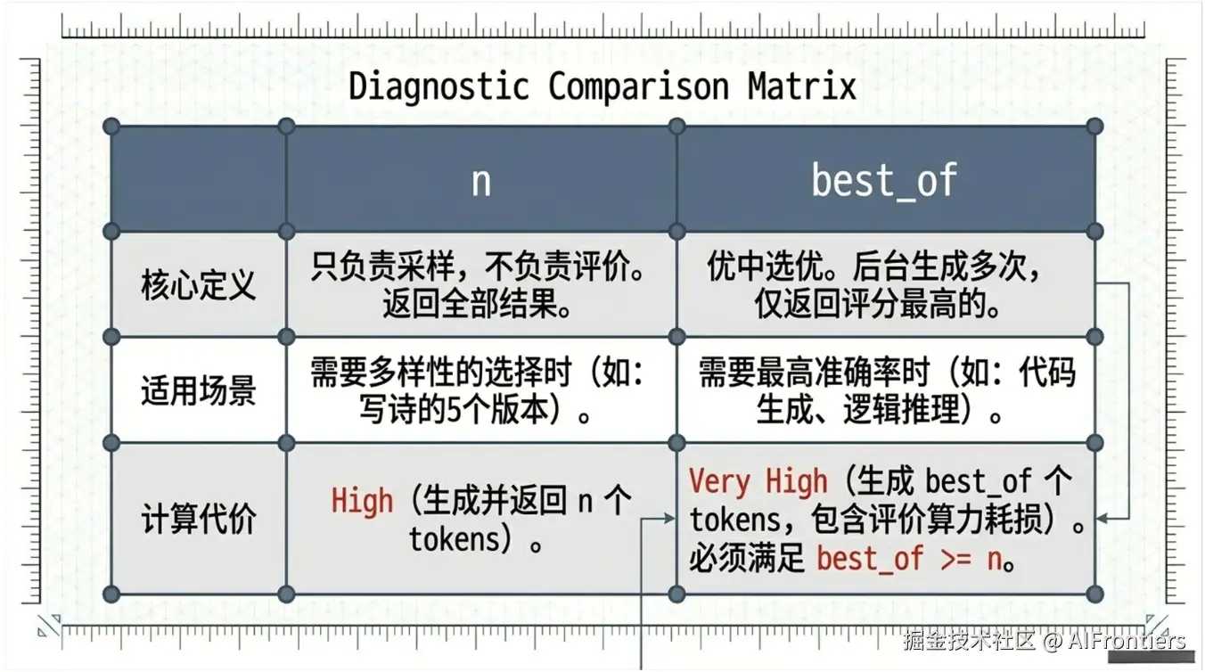best_of:优中选优。模型在后台生成 best_of 个结果,但返回其中得分最高的那几个(通常由 n 决定返回数量,且要求 best_of >= n)。适用于需要最准确的答案(如代码或逻辑推理),但希望模型多试几次,挑个最靠谱的。