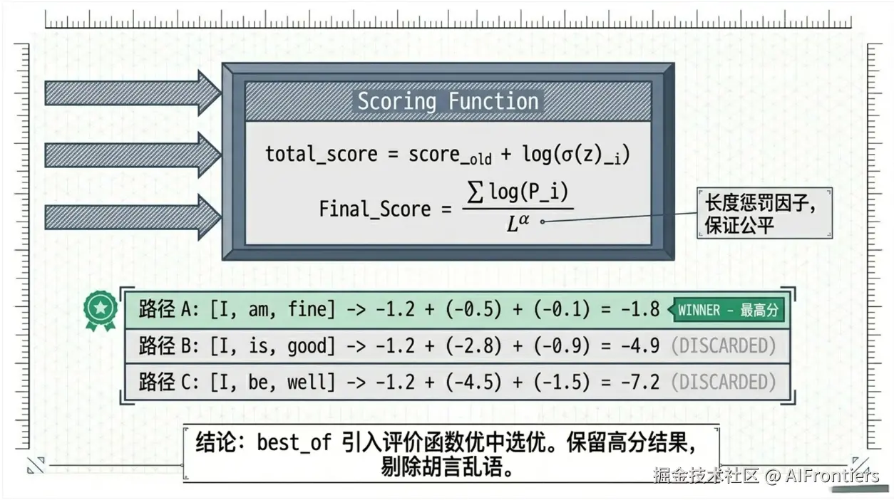 在实际工程(如 best_of)中,直接使用累积和会导致一个问题:长文本的得分总是比短文本低(每多生成一个 Token,就是在总分里加上一个值为负的对数概率)。为了公平竞争,推理引擎通常会对总分进行长度归一化处理: