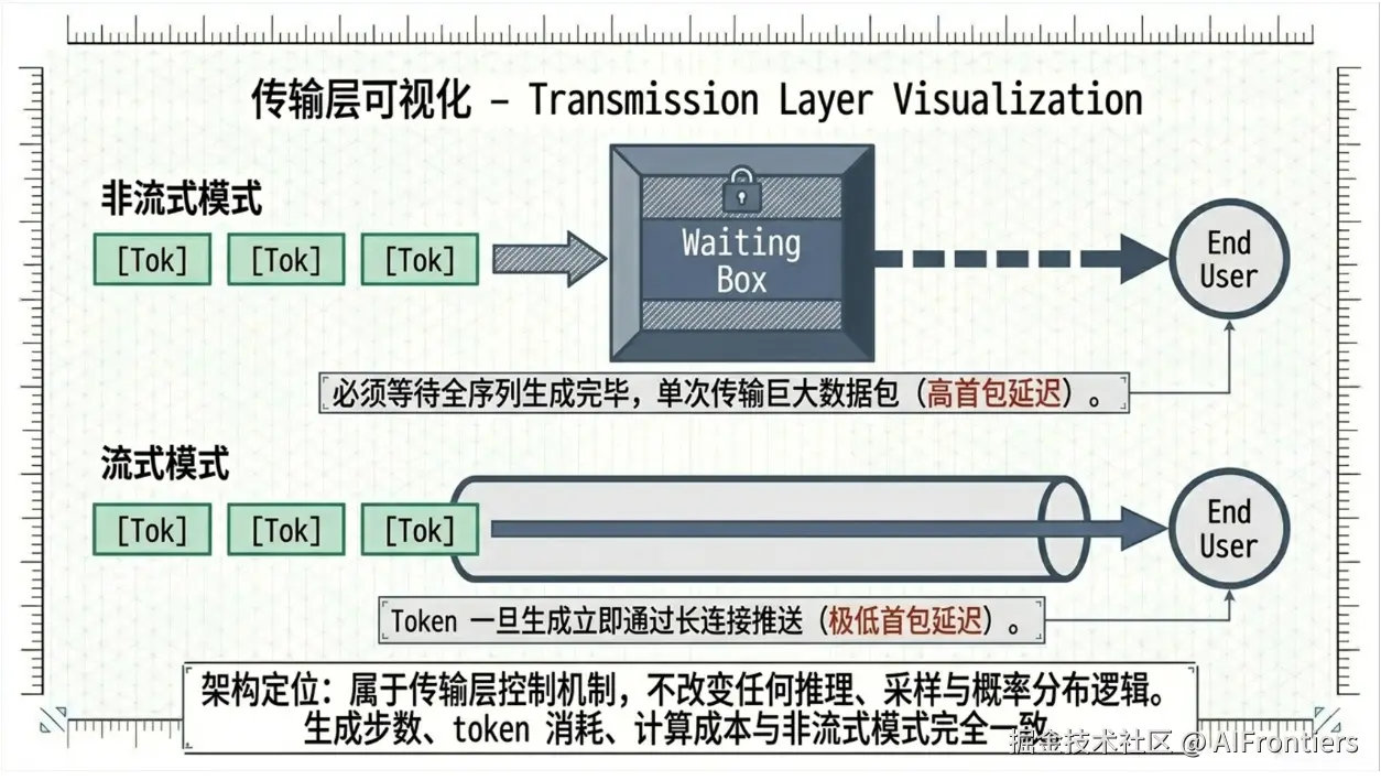 stream(流式输出)是大语言模型的传输层控制机制,不改变自回归生成的推理、采样与概率分布逻辑。底层实现为:模型每生成一个 token,立即通过长连接以数据块(chunk)形式实时推送给客户端,而非等待全部生成完成后一次性返回。开启 stream 可降低首包响应延迟,提升交互体验,但生成步数、token 消耗、计算成本与非流式模式完全一致。