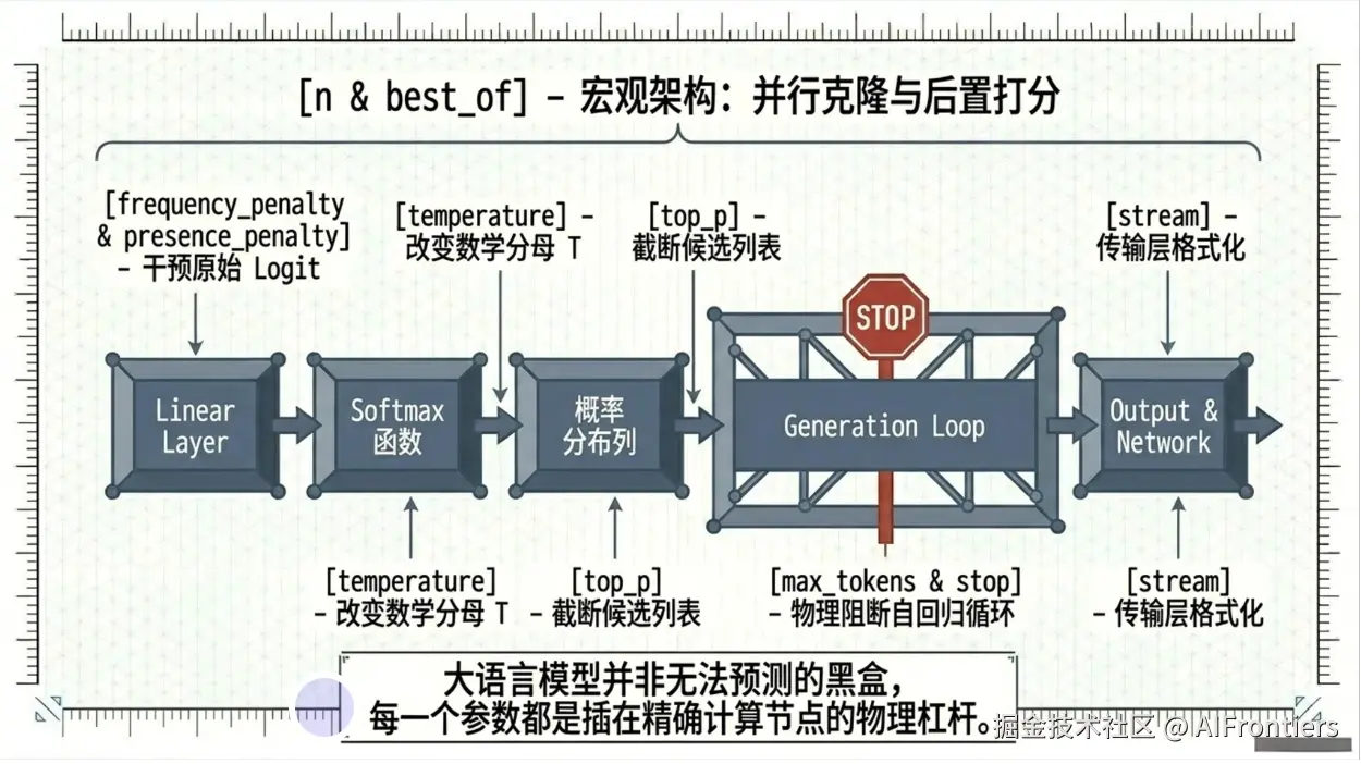 本篇从底层原理出发,以 Next Token Prediction 为核心,拆解了 LLM API 核心参数的作用:从 Linear Layer、 Softmax 函数出发,系统解析了 temperature、top_p、frequency_penalty、presence_penalty 对概率分布的调控逻辑,以及 max_tokens、stop、n、best_of、stream 对生成流程与输出形式的控制机制,揭示了各参数如何通过精准干预模型计算节点,实现对输出确定性、多样性、长度与成本的灵活调节。