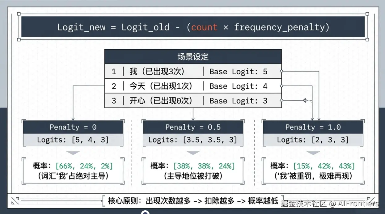 frequency_penalty=0.5: 分别为 [5−0.5×3, 4−0.5×1, 3−0]=[3.5, 3.5, 3],经过公式(2) Softmax 函数后,,候选词「我」被明显打压,不再一家独大。