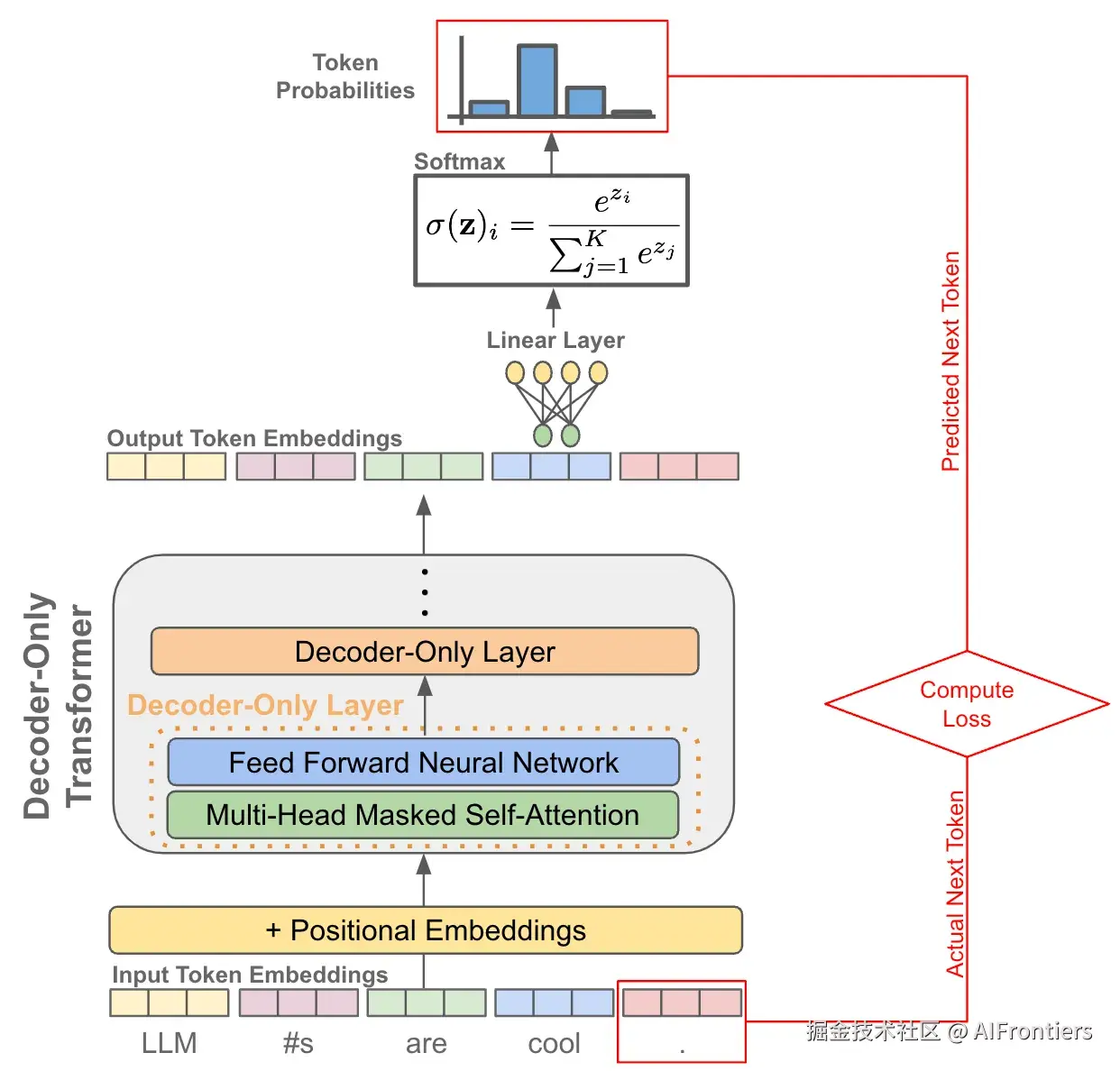 以上图中中输入「LLMs are cool」为例,模型经过「Linear Layer、Softmax 函数」运算后,映射为一组总和为 1 的概率分布:接「.」的概率可能是 80%,接「!」的概率是 15%,其他符号的概率为5%。通过这种方式,原本枯燥的数字转化成了模型对下一个词的「信心指数」。每预测出一个词,LLM 就会把这个词加入到输入序列里,再次循环上述过程。