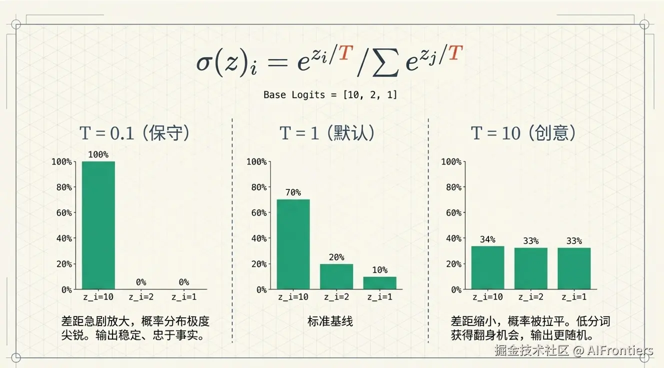 当 :缩小差距。概率分布变得平滑,原本概率较低的词也有了翻身的机会,模型变得「有创意」或「胡言乱语」。以取为例, 分别为 [1, 0.2, 0.1],经过公式(2) Softmax 函数后,,概率被拉平,三个词都有明显机会被选中,输出更随机、更多样。。