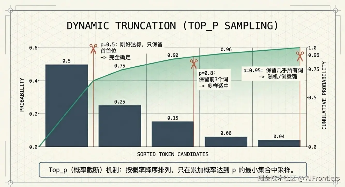 top_p 是动态的。它将词项按概率降序排列,只在累加概率达到 $$$$ 的最小集合中采样。