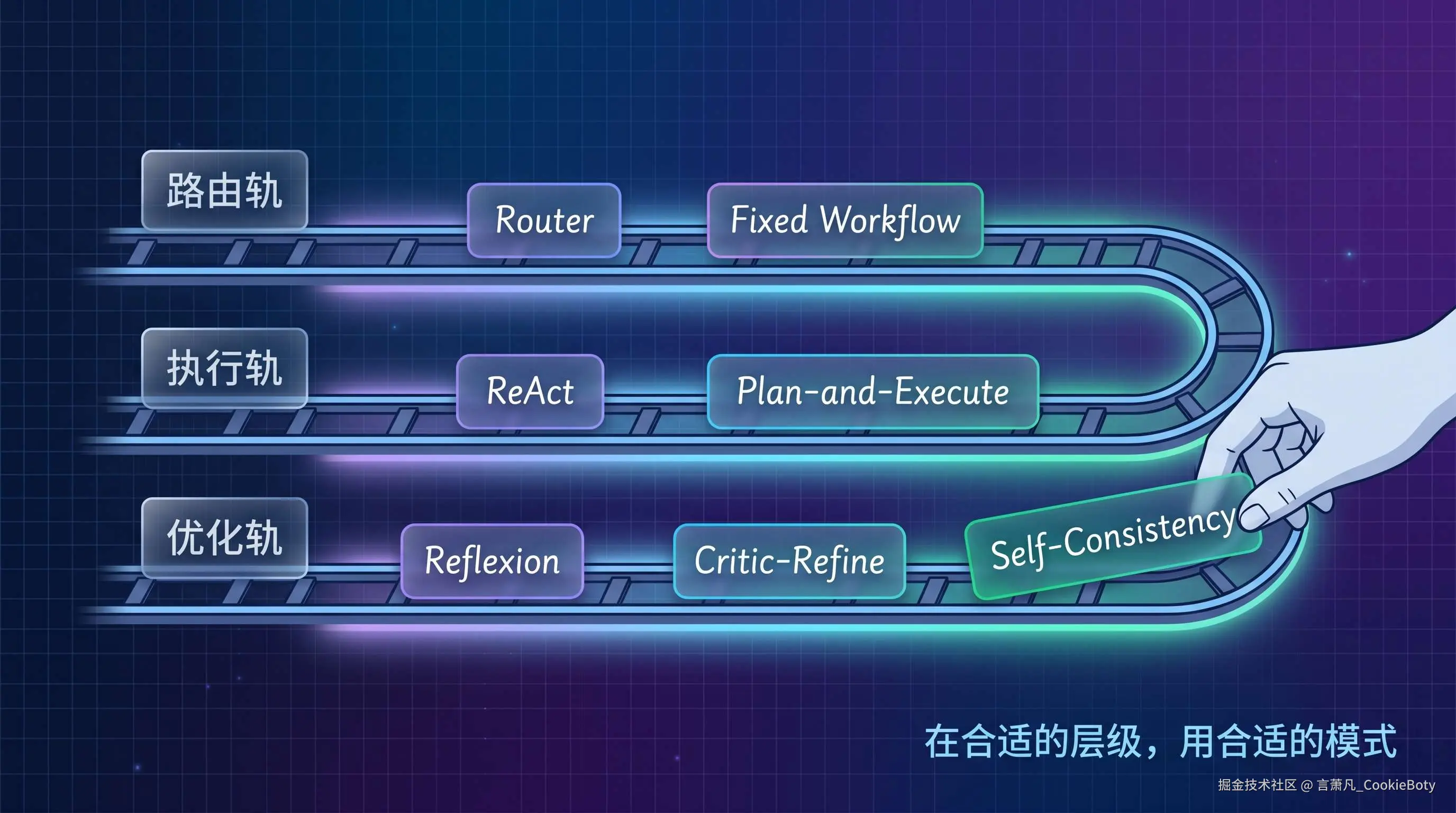 很多讲 Agent 的文章,都会把 ReAct、Plan-and-Execute、Reflexion、Self-Consistency、Critic-Refine、Router、Fixed Workflow 一股脑摆在一起。