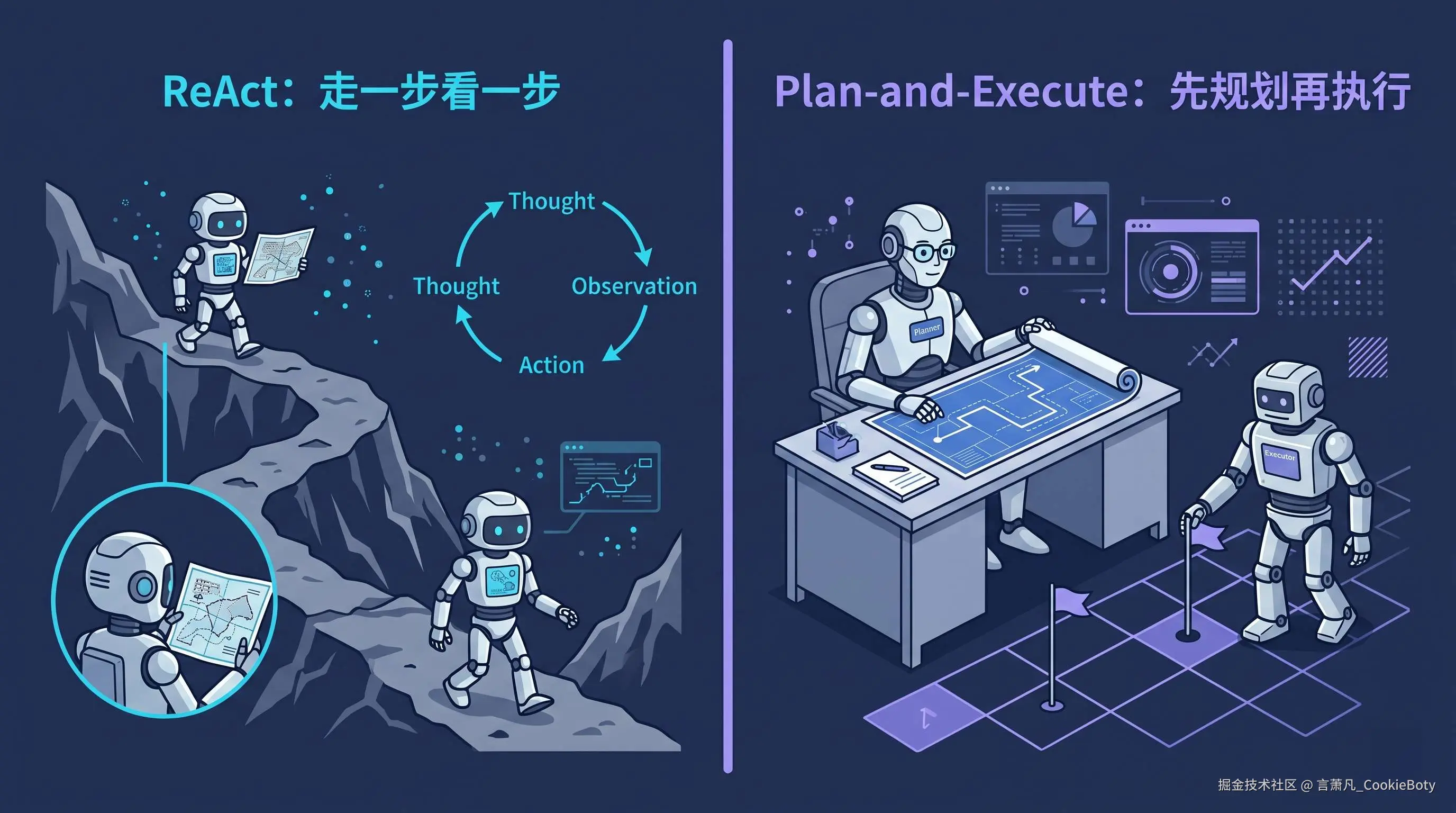 如果说 ReAct 是“走一步看一步”,那 Plan-and-Execute 更像“先画路线图,再按图执行”。