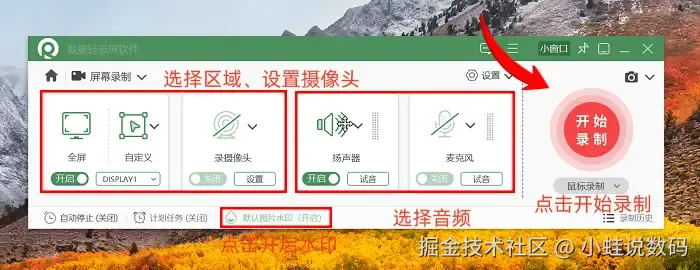 步骤2:进入屏幕录制模式的操作界面后,你可以自由划定需要录制的屏幕区域,同时选择合适的音频来源,如系统声音、麦克风声音或两者同时录制。在 “水印设置” 选项中,还可以自定义水印图片、水印位置等参数。所有设置都调整好之后,点击界面上的 “开始录制” 按钮,录屏就会正式开启。