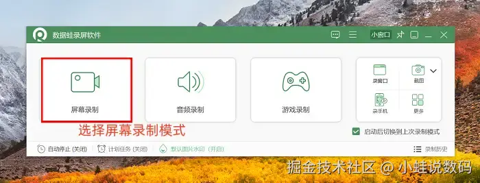 步骤1:电脑屏幕录制的方法是什么?先在电脑上运行数据蛙录屏软件,进入主界面后,根据自己的需求选择相应的录制模式。多数情况下,日常录屏选择 “屏幕录制” 模式最为合适,下面我们就以这个模式为例进行说明。