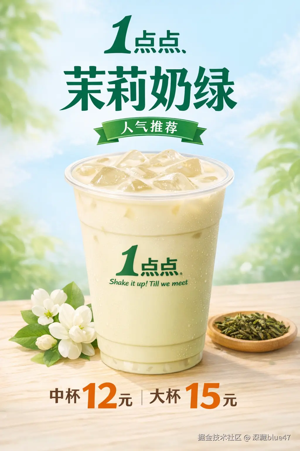 “请设计一张 3:4 竖版茶饮海报,品牌名为‘1点点’。整体风格清新自然、年轻活力、极简亲和。画面主体是一杯高颜值的茉莉奶绿(奶茶色泽清爽,质感丝滑,搭配1点点经典透明杯身)。海报中必须准确呈现以下文字:‘1点点’、‘茉莉奶绿’、‘人气推荐 中杯 16 元 大杯 19 元’。要求海报具备明显促销信息层级,重点测试小字、数字与中文字体美感,保留品牌辨识度,不要做成廉价电商海报。”