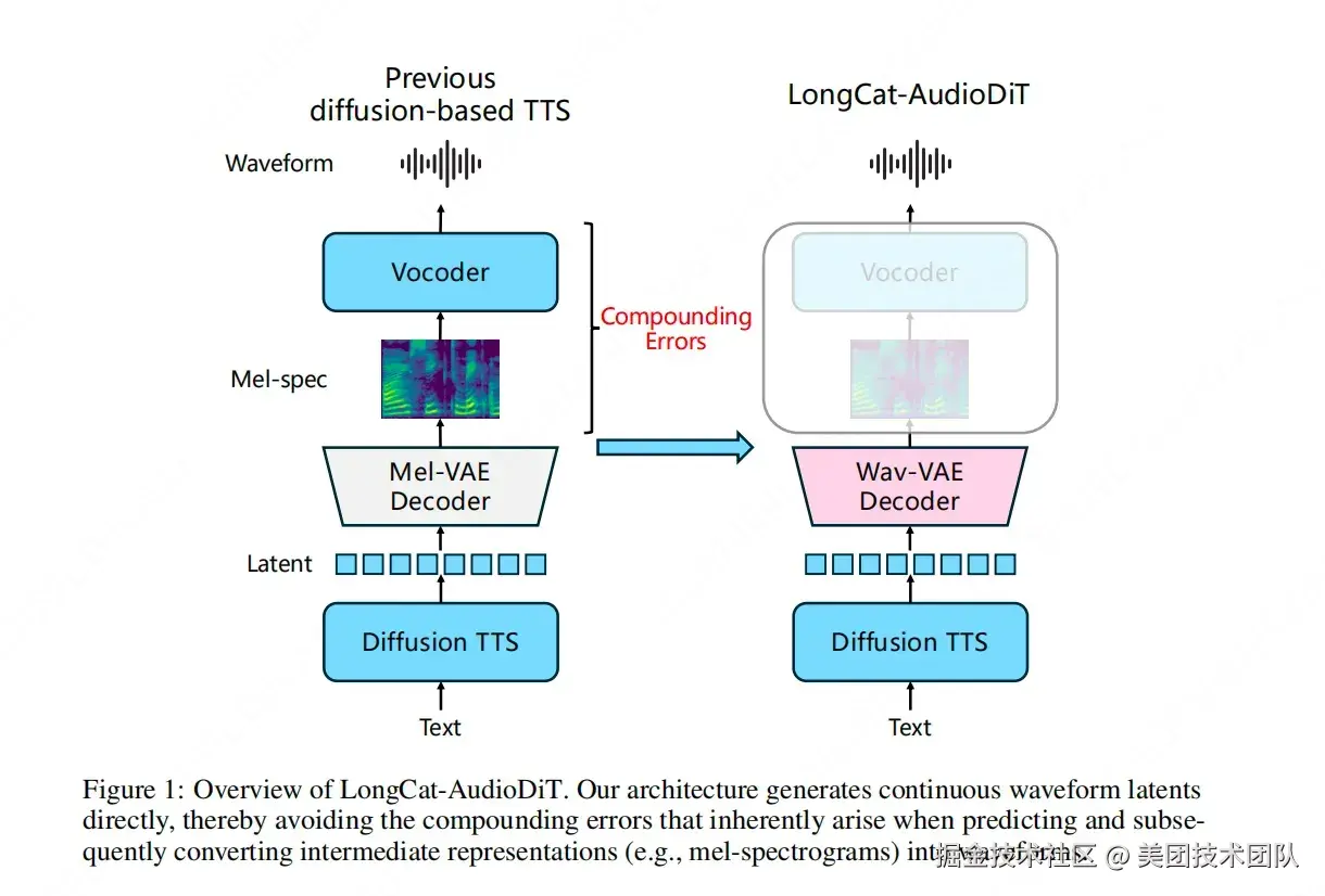 为破解这一技术瓶颈,美团 LongCat 团队正式发布 LongCat-AudioDiT。在该模型中,我们彻底抛弃梅尔谱等中间表示,直接在波形潜空间进行基于扩散模型的文本转语音(Text-to-Speech, TTS),从根源阻断数据转换的级联误差。