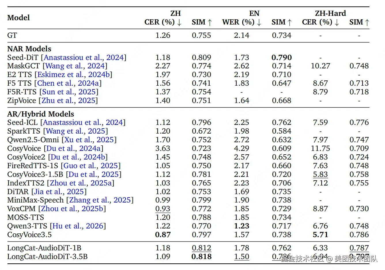 - 中文 CER:LongCat-AudioDiT-1.1B 为 1.18%,LongCat-AudioDiT-3.5B 为 1.09%。在 NAR(非自回归)模型中表现非常出色。