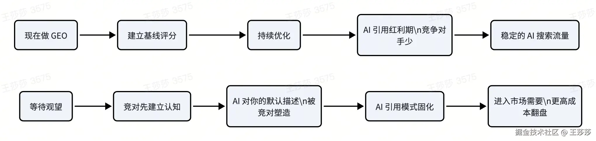 窗口期: ChatGPT 的引用机制还在演化,Claude 的偏好还在建立,国内模型的训练数据更新周期更快。现在做 GEO,是在一个认知空白期建立你的位置。等竞对把这个位置占了,你进入市场需要的不是"优化",而是"翻盘"——成本完全不一样。