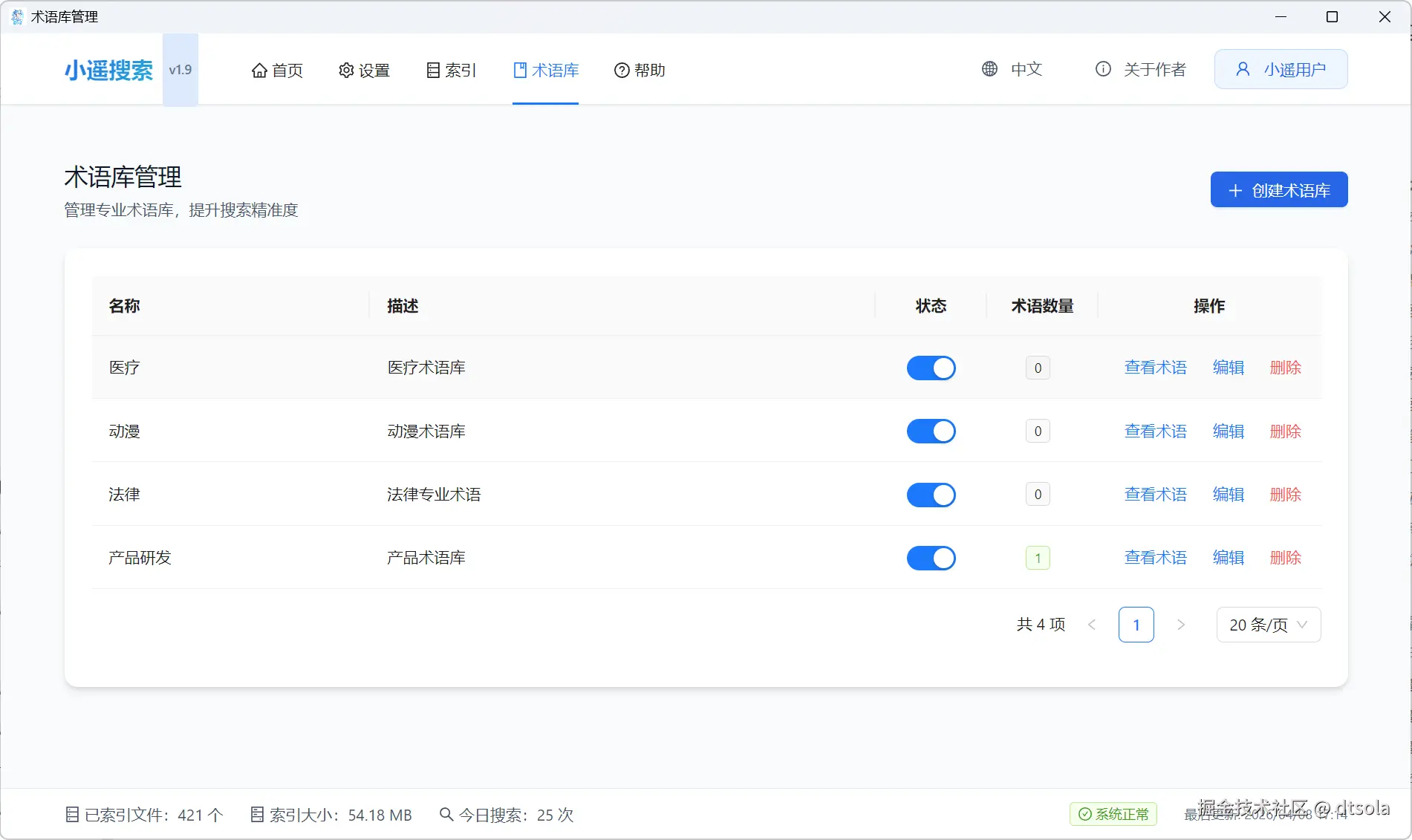 小遥搜索 v1.9.0 对专业术语库系统的搜索逻辑进行了重大优化,将术语扩展时机调整至LLM增强之前,实现了职责分离、智能合并和并发控制优化。这些改进使搜索召回率提升60% ,同时确保系统在高负载情况下的稳定性。