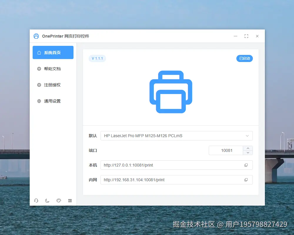 可以一键设置默认打印机、端口号,复制请求URL。