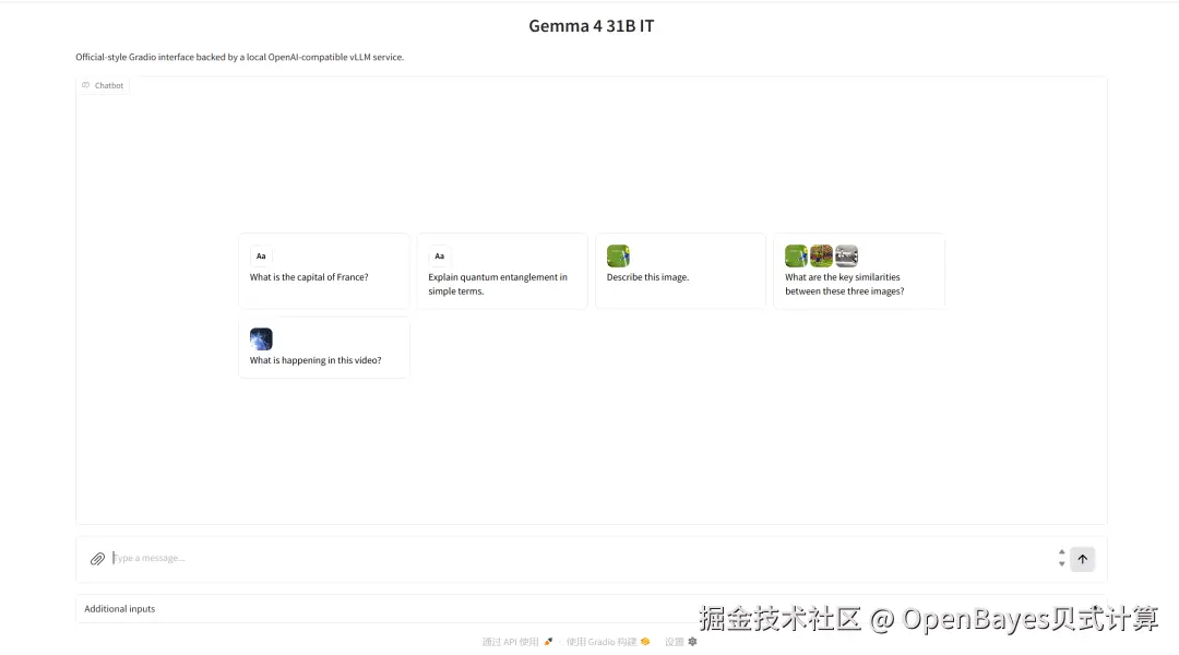 Gemma-4-31B-it 由 Google DeepMind 于 2026 年 4 月 2 日发布,是 Gemma 4 系列中的 31B Dense 指令模型。该模型支持文本与图像输入、文本输出,提供最长 256K 上下文窗口,并原生支持 reasoning、function calling 与 system prompt,适合构建高质量问答、代码辅助与智能体服务,支持 140 多种语言,主要面向推理、编程、智能体工作流与多模态理解任务。