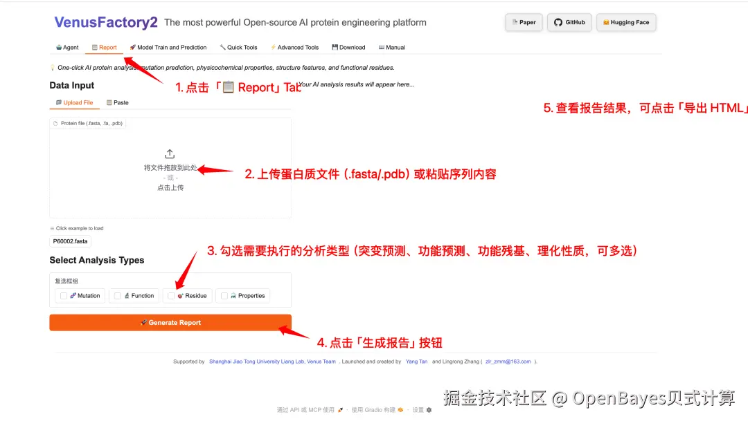 VenusFactory2 由上海交通大学、华东理工大学的联合团队开发。VenusFactory2 是一个 Agent 驱动的蛋白质工程平台,集成 40+ AI 模型与 11 个生物数据库。平台提供 Web 界面、REST API、CLI 三种使用方式,方便计算机科学和生物学领域的研究人员使用。