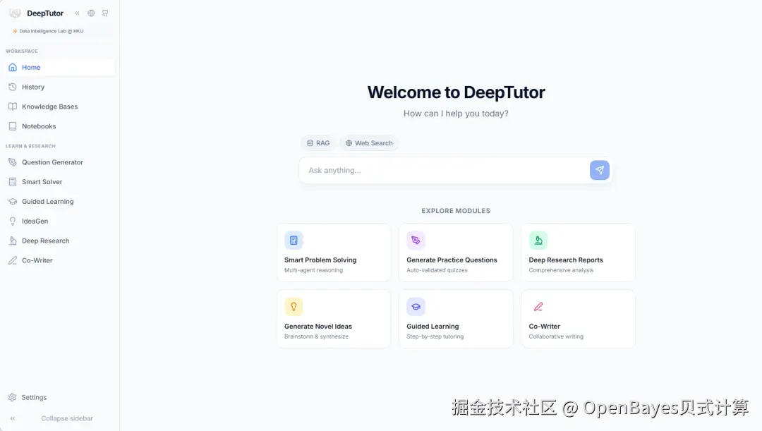 DeepTutor 是香港大学数据智能实验室于 2026 年 3 月推出的个人学习助手,是一个全能型 AI 驱动的教学系统。该项目整合了海量文档知识问答、交互式学习可视化、知识强化与练习题目生成以及深度研究与想法生成四大核心功能模块,为学习者提供一站式的智能学习体验。
