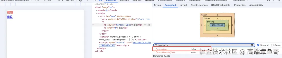 代码同上,比如还是p标签,我们没有自定义声明它的font-size,用户代理样式表也同样没有声明,它的父级元素同样没有声明,这也就说明对于font-size来说既没有声明值也没有继承值,那它最终渲染是按多大的字号来呈现的呢?