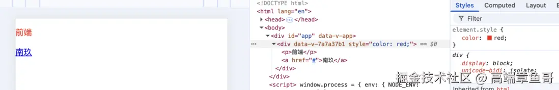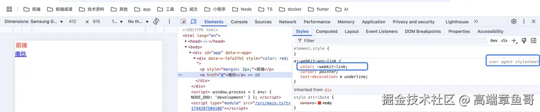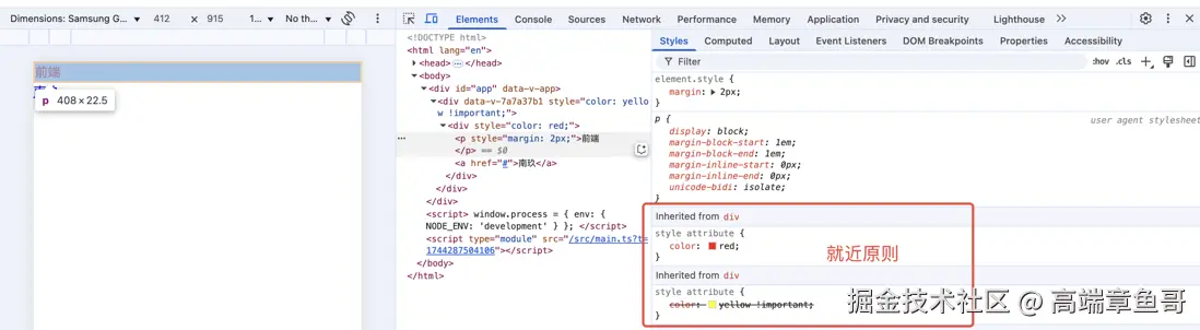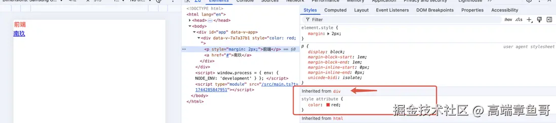 同样还是上面的代码,我们可以看到对于p标签我们既没有声明他的文字颜色,用户代理样式表同样也没声明文字颜色,那么它的红色是从哪来的呢?