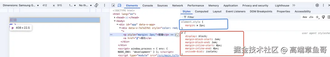 由于开发者自定义声明样式表与用户代理样式表都有定义margin值,最终应用的是开发者自定义声明样式表,所以开发者自定义声明样式表的权重要高于用户代理样式表