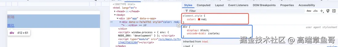 当前div既有开发者自定义声明样式(红框)也有用户代理样式(蓝框),这两块都属于声明值。