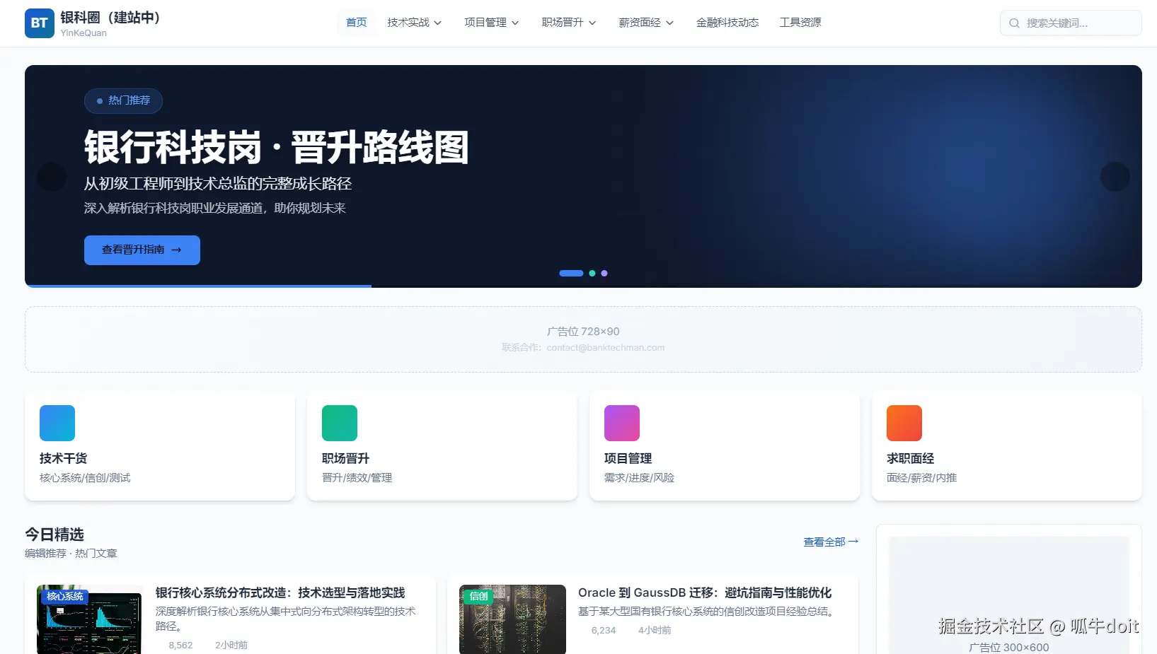 - 主内容区:包含轮播图、广告位、快捷导航、精选文章、热门分类、金融科技每日速递和侧边栏