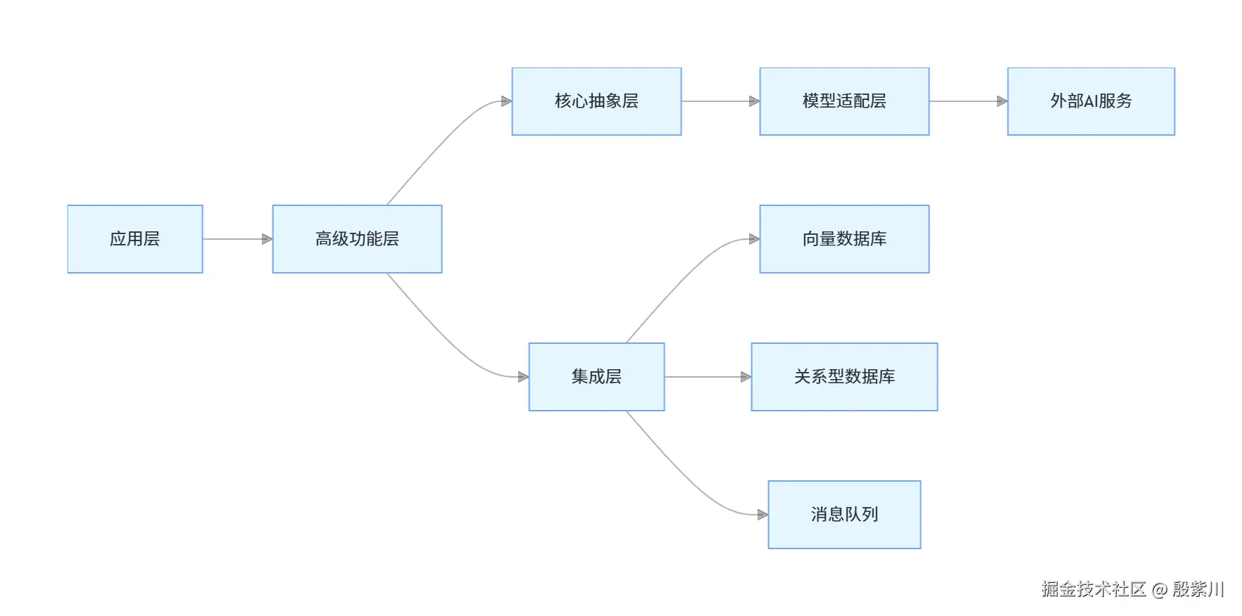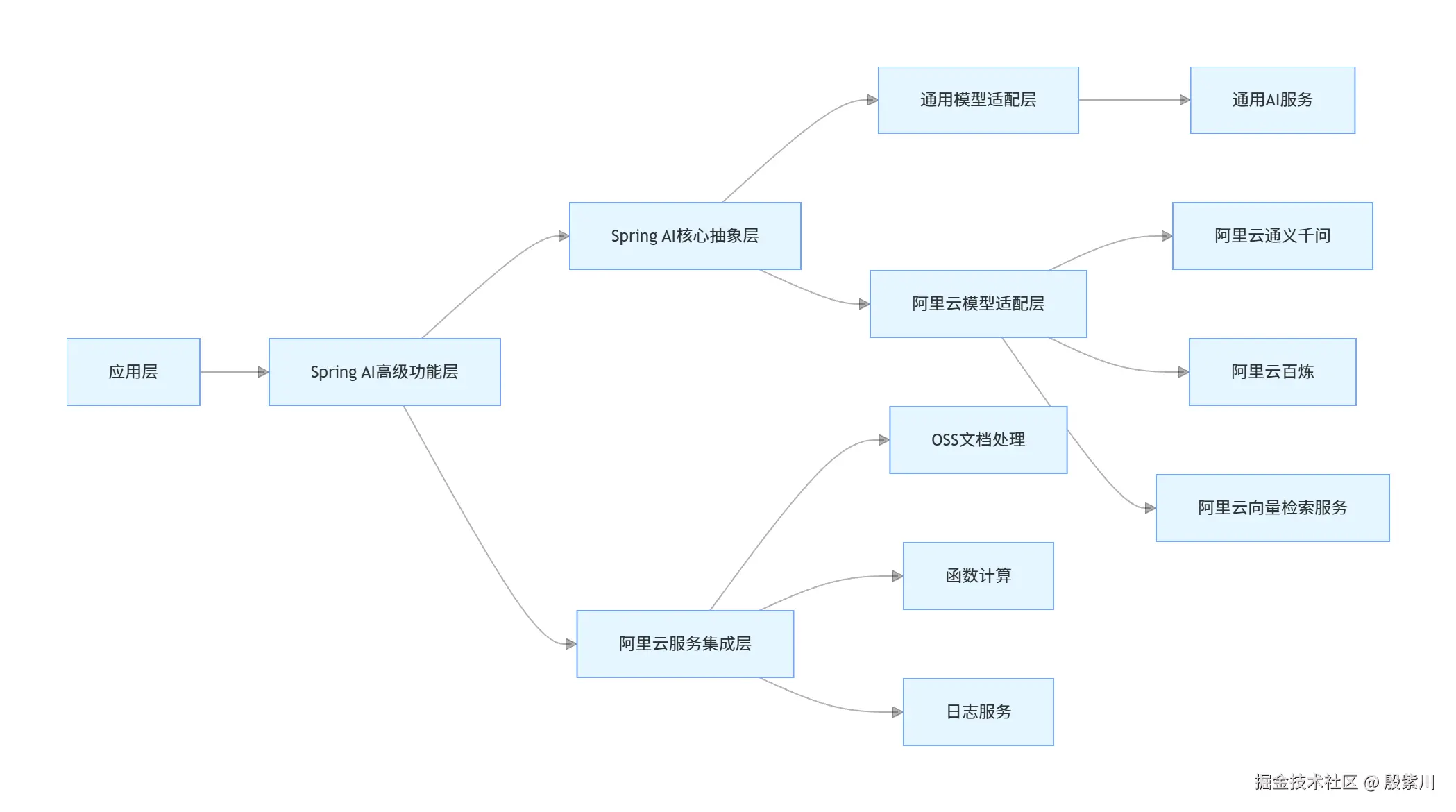 Spring AI采用了分层架构设计,从下到上依次为:模型适配层、核心抽象层、高级功能层和集成层。