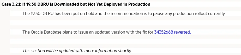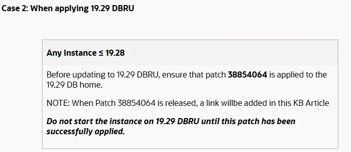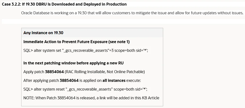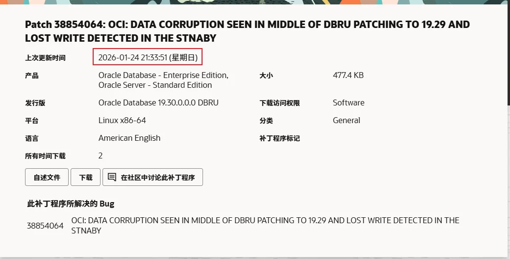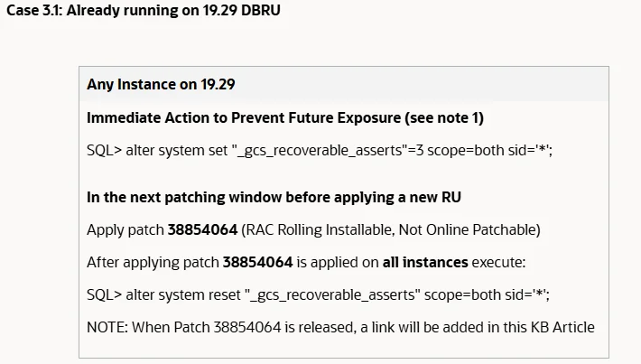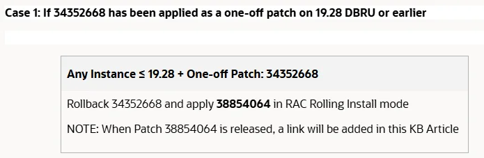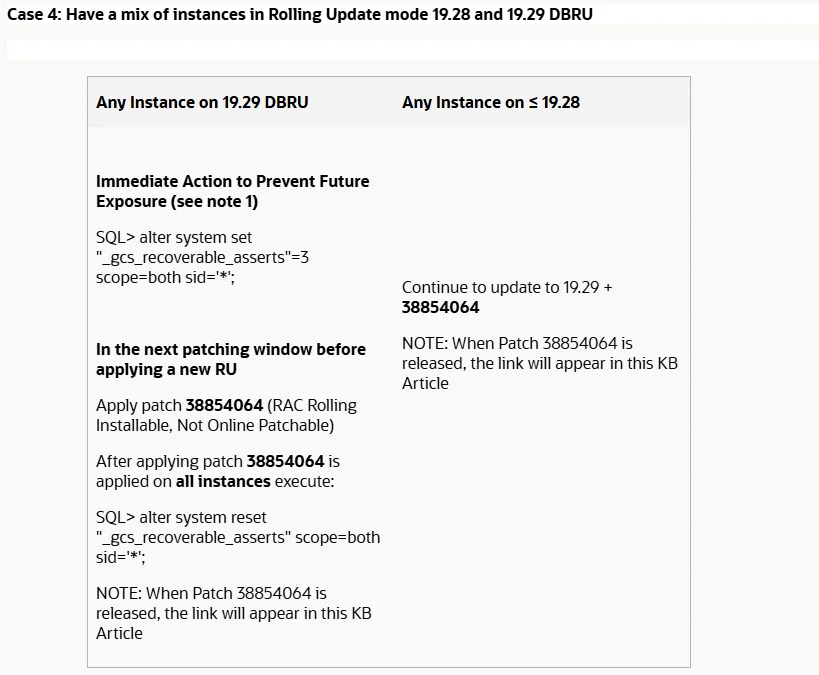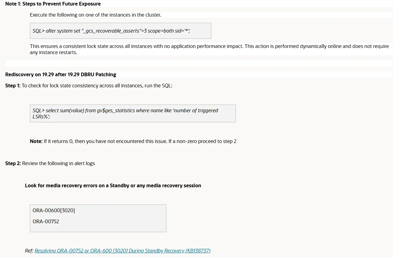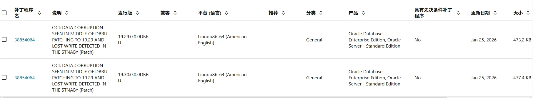 在 19.29 DBRU 版本中,Bug 34352668 可能导致某些实例在滚动更新期间禁用 RAC 锁状态错误处理。在某些全局缓存挂起的情况下,这可能会导致锁状态不一致,并且在极少数情况下会导致数据块损坏。应用 Bug 38854064(RAC 滚动更新可安装;不可在线修补)可以解决此问题。
