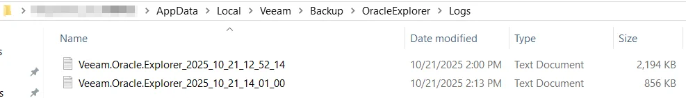 恢复日志一般存放于 VBR 的 C:\Users\Administrator\AppData\Local\Veeam\Backup\OracleExplorer\Logs 目录下: