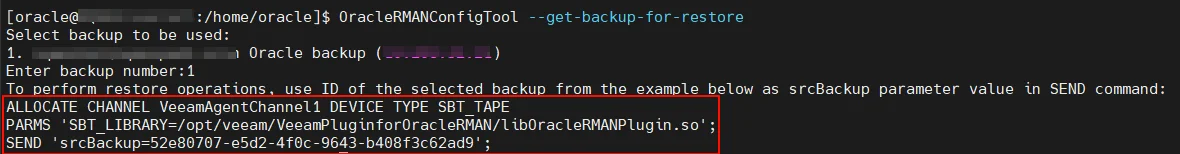 ALLOCATE CHANNEL c0 DEVICE TYPE sbt PARMS 'SBT_LIBRARY=/opt/veeam/VeeamPluginforOracleRMAN/libOracleRMANPlugin.so';