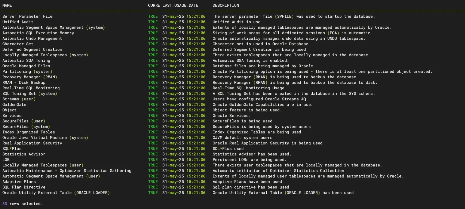DBA_FEATURE_USAGE_STATISTICS 是 Oracle 提供的关键数据字典视图,用于跟踪数据库功能使用情况(从数据库上次启动开始,每 7 天采样一次),非常适用于许可证合规性管理和容量规划。