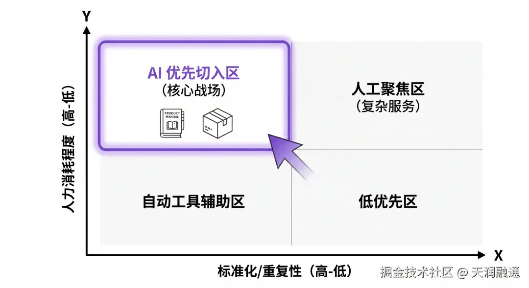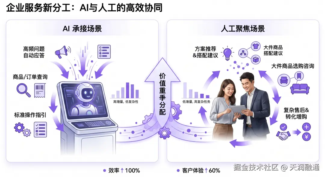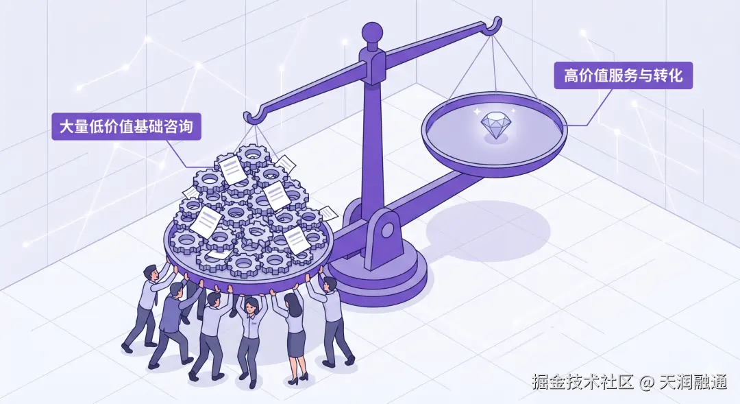 把标准化、重复性的工作交给AI,把有限的人工能力留给那些更需要判断、更能影响客户体验、也更有可能创造增长价值的环节。