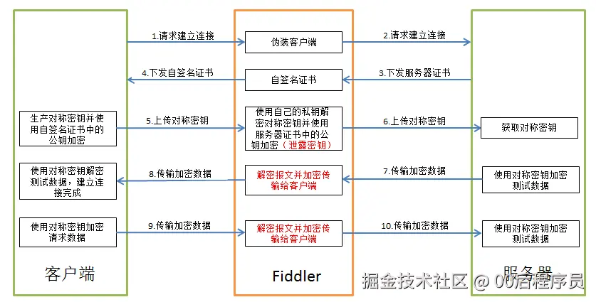 - Fiddler拦截客户端的请求以后,使用私钥解密该报文,获取对称加密秘钥,并使用服务器证书中带的公钥加密该对称密钥发送给WEB服务器。此时对称密钥已经泄露了,以后可以使用该秘钥界面客户端和服务器端传输的数据。